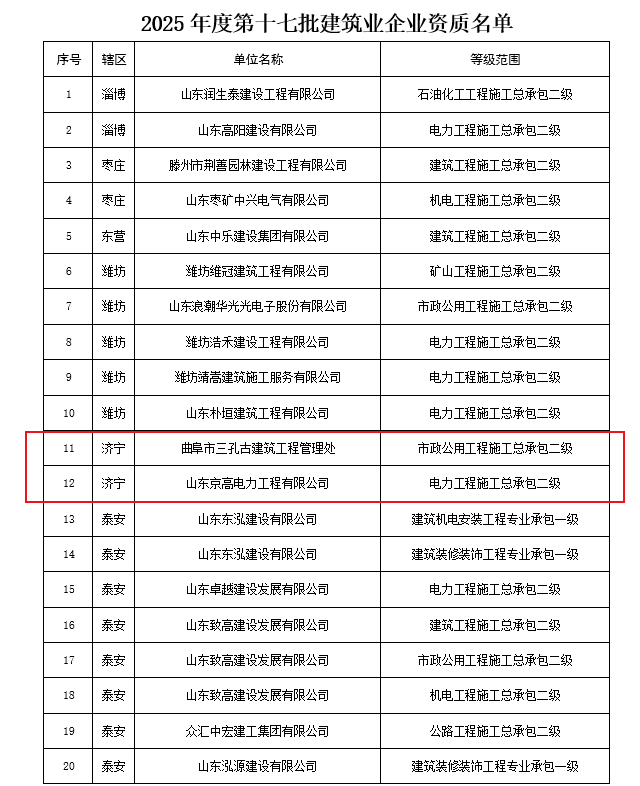 搜狐网济宁小编了解到:近日,山东省住房和城乡建设厅发布关于2025年度第十七批建筑业企业资质名单的公告,根据《建筑业企业资质管理规定》(住房城乡建设部第22号令)及有关实施要求,山东省住房和城乡建设厅对2025年度第十七批建筑业企业资质的申请材料进行了公示,现将核准的名单予以公告。
