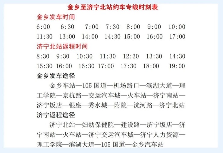 近日,金乡汽车站发布信息,金乡至济宁约车已经改版,4月11日发车。