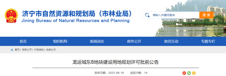 近日,搜狐网济宁小编了解到:济宁市自然资源和规划局收到济宁运河广厦城市更新发展有限公司关于龙运城东B地块项目的建设用地规划许可申请,根据《中华人民共和国城乡规划法》《山东省城乡规划条例》等法律法规和国家、省有关规定,经审核,该建设用地符合国土空间规划和用途管制要求,现对核发该项目建设用地规划许可进行批前公告,如有意见或建议,请在公告期内及时反馈至济宁市自然资源和规划局,公告期限内若无异议,将依法核发该项目用地规划许可证。