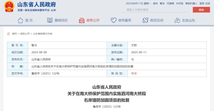 你市《关于恳请在省级文物保护单位兖州泗河南大桥保护范围和建设控制地带内实施兖州区泗河南大桥段右岸堤防加固工程的请示》(济政呈〔2025〕11号)收悉。经研究,批复如下: