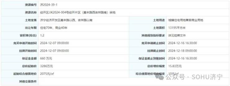 土地位于:济宁经济开发区嘉丰路以西、吉祥路以南;土地面积:13195㎡(约19.8亩);土地用途:城镇住宅用地兼容商业用地;出让年限:住宅70年、商业40年;容积率不大于1.2;起始价:3286万元,综合楼面价起价:2075元/㎡;最终成交价为:3286万元(约166万元/亩),综合楼面地价成交价:2075元/㎡;溢价率:0.0%;