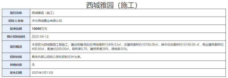 2025年3月13日,济宁市公共资源交易服务中心发布了西城雅园(施工)的招标计划,项目估算投资为1亿元。