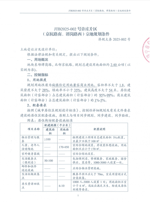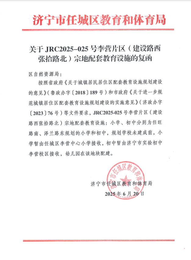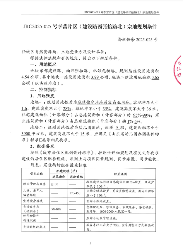 地块二:任城区JRC2025-025号李营片区(建设路西张拾路北)地块一【济宁任合天昱置业有限公司竞得】