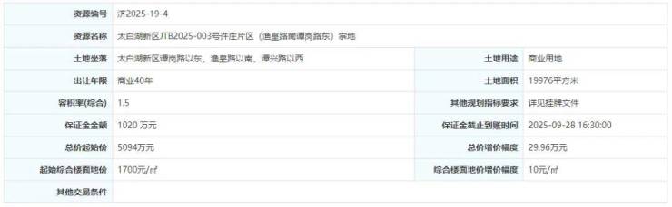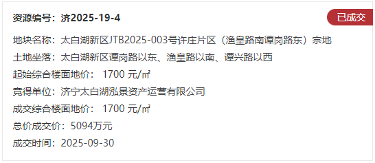 地块四:太白湖新区JTB2025-003号许庄片区(渔皇路南谭岗路东)宗地【济宁太白湖泓景资产运营有限公司竞得】