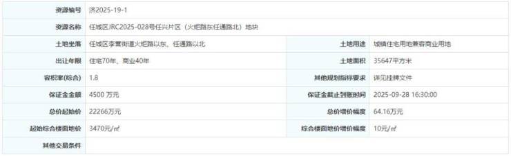 土地位于:任城区李营街道火炬路以东、任通路以北;土地面积:35647㎡(约53亩);土地用途:城镇住宅用地兼容商业用地;出让年限:住宅70年、商业40年;容积率不大于1.8;起始价:22266万元,综合楼面价起价:3470元/㎡;最终成交价为:22266万元(约420万元/亩),综合楼面地价成交价:3470元/㎡;溢价率:0.0%;