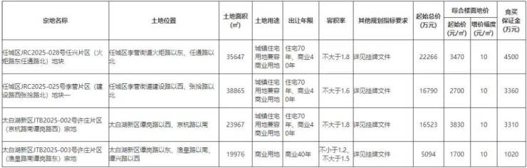 其中,任城区JRC2025-028号任兴片区(火炬路东任通路北)地块、任城区JRC2025-025号李营片区(建设路西张拾路北)地块一、太白湖新区JTB2025-002号许庄片区(京杭路南谭岗路西)宗地不接受个人申请竞买,包括以个人名义申请竞买、约定竞得后成立公司作为受让人进行开发建设情形。