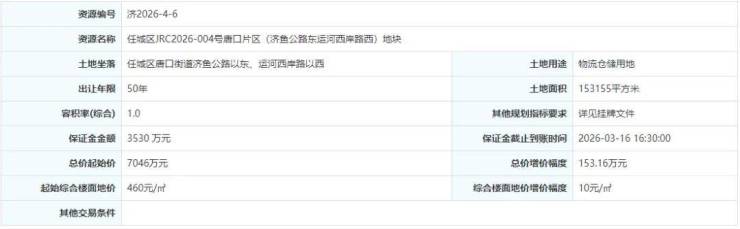 土地位于:任城区唐口街道济鱼公路以东、运河西岸路以西;土地面积:153155㎡(约230亩);土地用途:工业用地;出让年限:50年;容积率不小于1.0;起始价:7046万元,综合楼面价起价:460元/㎡;因无竞买方出价,本地块流拍。