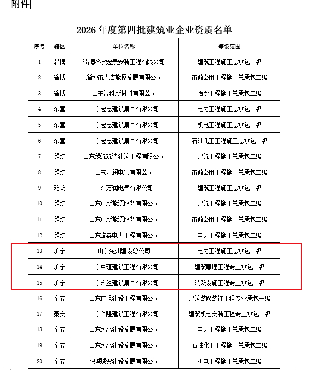 搜狐网济宁小编了解到:近日,山东省住房和城乡建设厅发布关于2026年度第四批建筑业企业资质名单的公告,根据《建筑业企业资质管理规定》(住房城乡建设部第22号令) 及有关实施要求,山东省住房和城乡建设厅对2026年度第四批建筑业企业资质的申请材料进行了公示,现将核准的名单予以公告。
