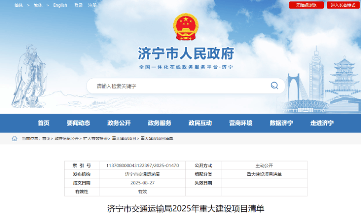 近日,搜狐网济宁小编从济宁市人民政府官网获悉市交通运输局2025年重大建设项目清单,具体内容如下