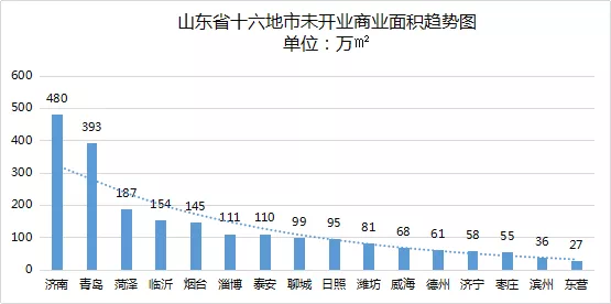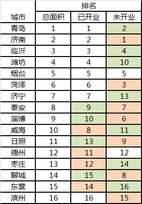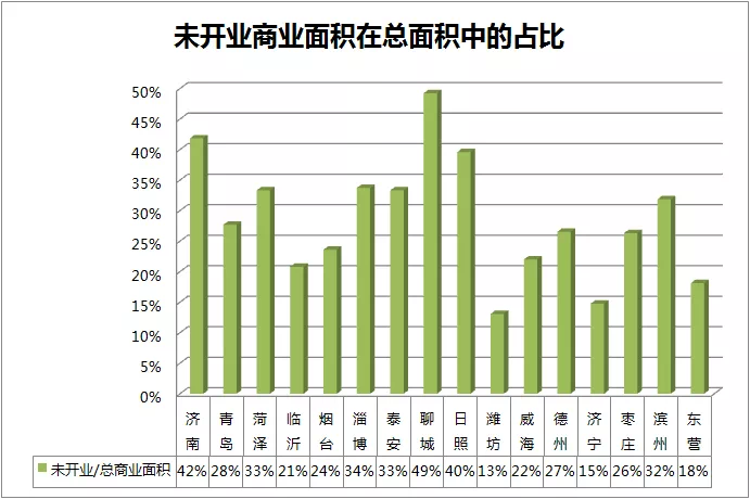 未开业商业面积排名跃升的城市主要有:济南、菏泽、淄博、泰安、聊城、日照、滨州。