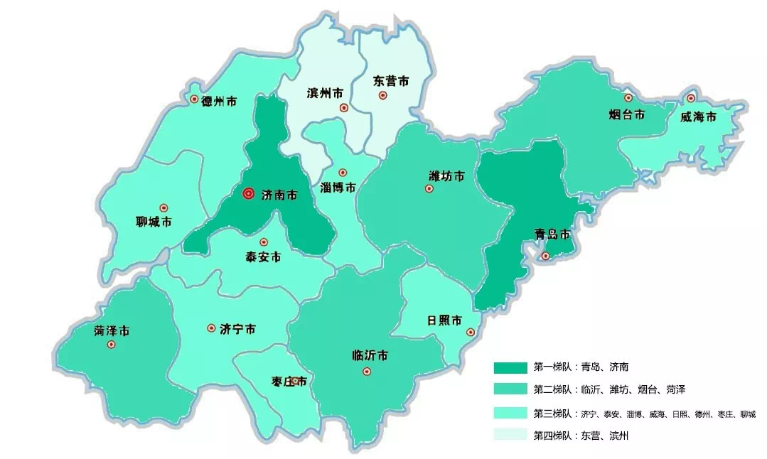 临沂、潍坊、烟台、菏泽位于第二梯队,这四个城市也是辖区面积位于山东前四名的城市;