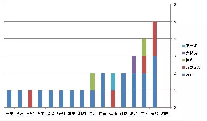 从上表可以看出,目前山东省已经开业的全国一线商业综合体品牌中,万达数量最多,在全省13个地市开业了19个项目。更是在青岛的李沧、CBD和台东落地了三个万达广场,济南、烟台、潍坊和东营也均有两个。