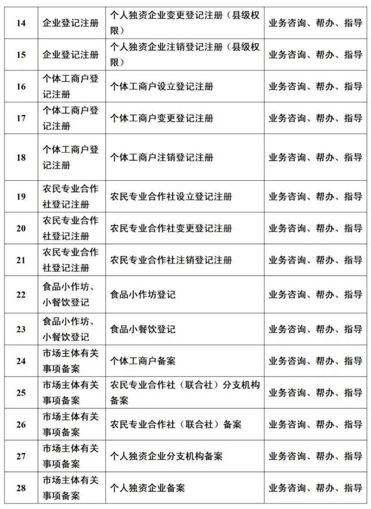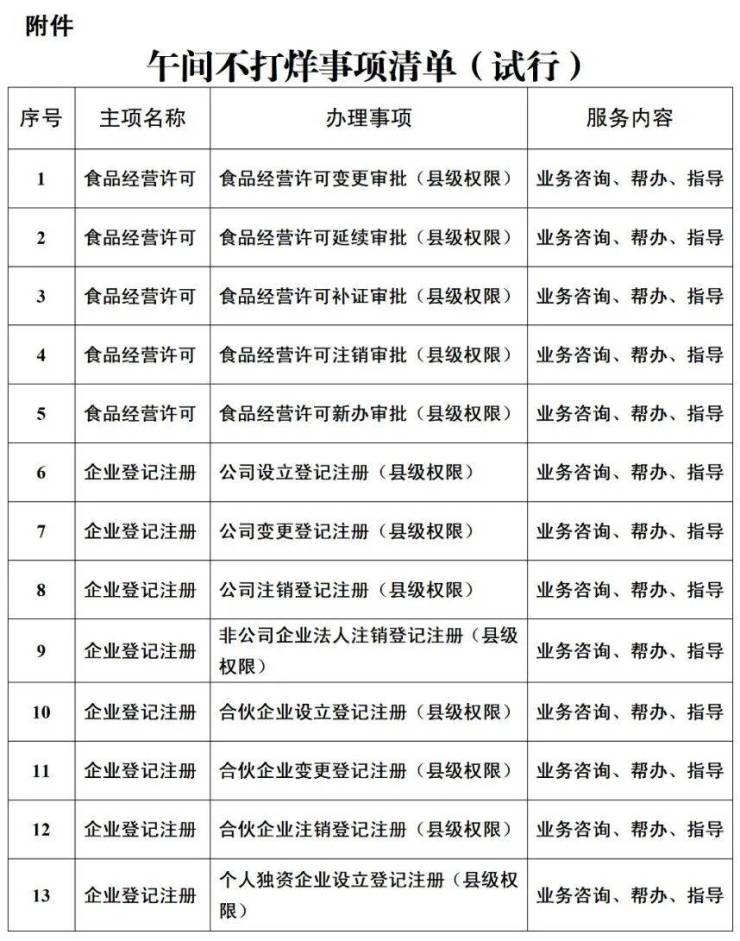 午间不打烊事项包括市场主体登记类事项和便民服务类事项(帮办代办、免费邮寄、免费复印等),以上事项午间均可正常提供咨询、帮办、指导服务(详见附件《午间不打烊事项清单》(试行))。