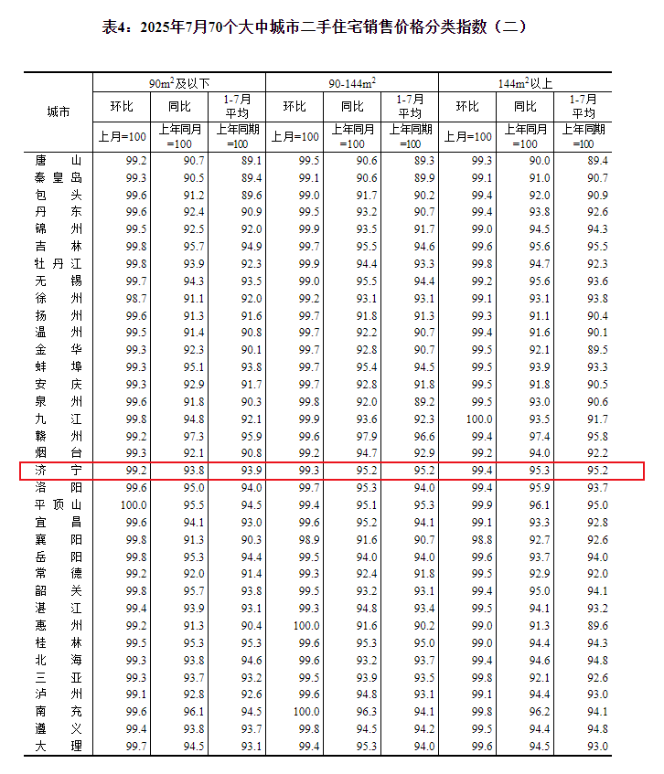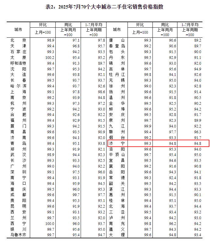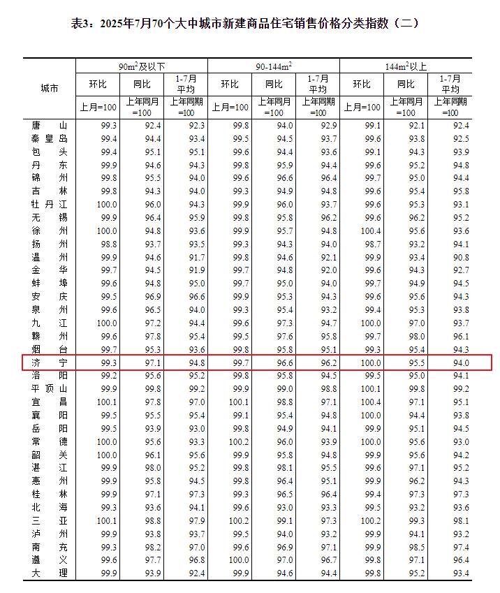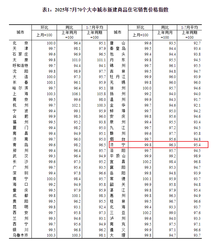 搜狐网济宁小编注意到:今早9点30分,国家统计局发布了2025年7月份70个大中城市商品住宅销售价格变动情况统计数据。2025年7月份济宁新建商品住宅销售价格环比下降0.2个百分点。