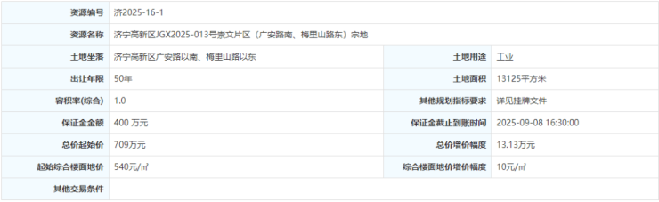 土地位于:济宁高新区广安路以南、梅里山路以东;土地面积:13125㎡(约20亩);土地用途:工业用地;出让年限:50年;容积率不小于1.0;起始价:709万元,综合楼面价起价:540元/㎡;