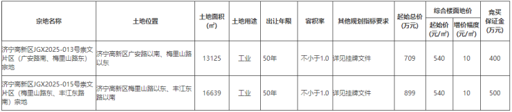 2. 济宁高新区JGX2025-015号崇文片区(梅里山路东、丰江东路南)宗地:2025年8月30日9时00分至2025年9月10日9时10分;