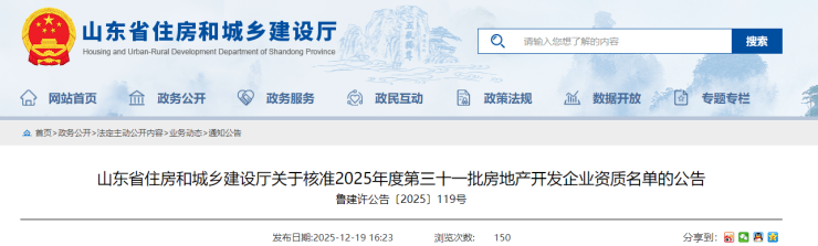 近日,搜狐网济宁小编了解到:根据《关于修改<房地产开发企业资质管理规定>的决定》(住房和城乡建设部令第54号)及有关实施要求,山东省住房和城乡建设厅对2025年度第三十批房地产开发企业资质的申请材料进行了公示,现将核准的名单予以公告。