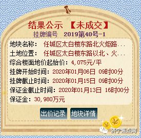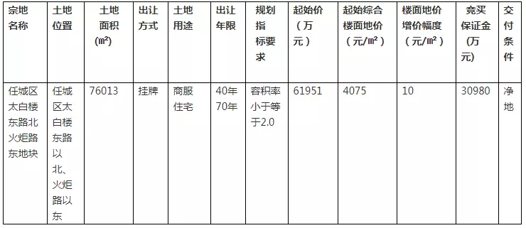 地块1:任城区太白楼东路北火炬路东地块(流拍)土地位于:任城区太白楼东路以北、火炬路以东;土地面积:76013㎡(约114亩);土地用途:商住用地;出让年限:商业40年、住宅70年;容积率小于等于2.0;起始价:61951万元,综合楼面价起价:4075元/㎡;交付条件为净地;因无竞价方出价,本地块流拍;