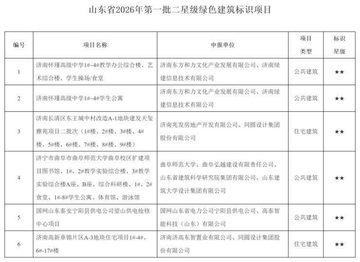 按照住房和城乡建设部《绿色建筑标识管理办法》(建标规〔2021〕1号)、《山东省绿色建筑标识管理办法》(鲁建节科字〔2021〕7号)、《绿色建筑评价标准》(GB/T 50378-2019)、《绿色建筑评价标准》(DB/T 5097-2021)等文件和标准规范,经评审、公示等程序,济南怀瑾高级中学1#~4#教学办公综合楼、艺术综合楼、学生操场/食堂等6个项目获得2026年第一批二星级绿色建筑标识。