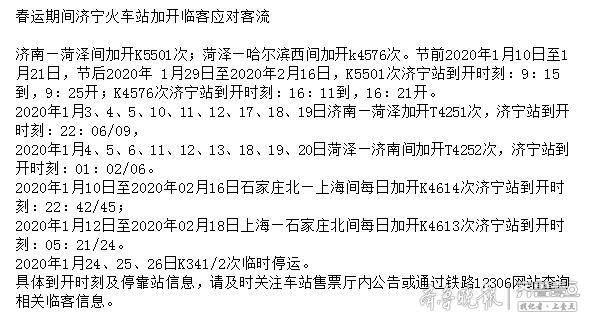 济宁火车站2020年1月3、4、5、10、11、12、17、18、19日济南—菏泽加开T4251次,济宁站到开时刻:22:06/09;2020年1月12日至2020年02月18日上海—石家庄北间每日加开K4613次济宁站到开时刻:05:21/24。