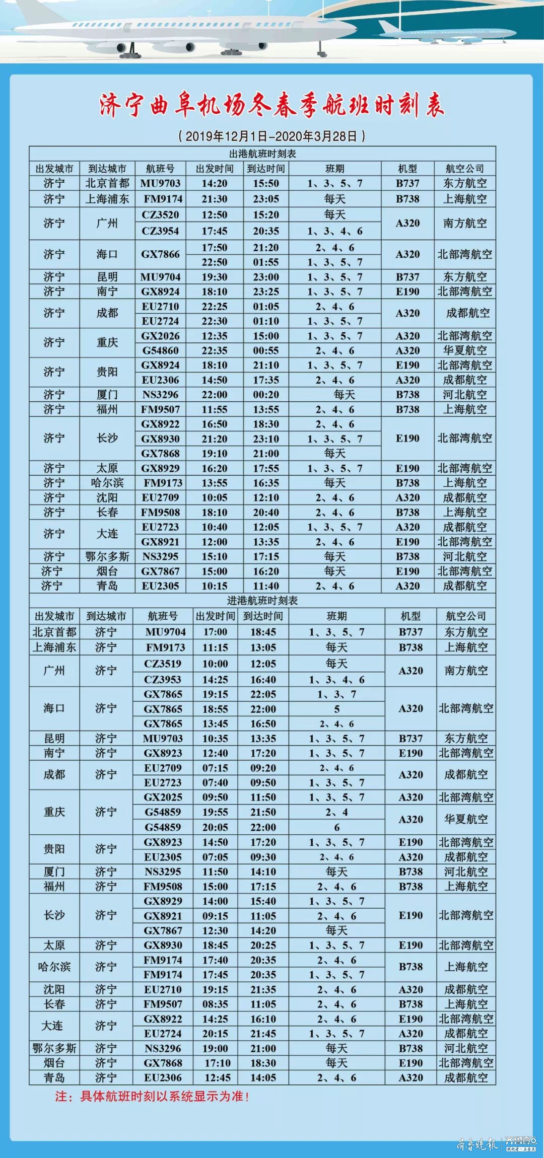 民航方面,今年春运期间,济宁曲阜机场预计旅客吞吐量能达到16万人次以上,为应对客流高峰,济宁曲阜机场将正在运行每日一班的广州至济宁航线在周一、三、四、六再各加开一班,通过航班换季,济宁至海口、厦门、鄂尔多斯、烟台、重庆等热点旅游城市也进行了新增和加密,方便旅客出行需求。