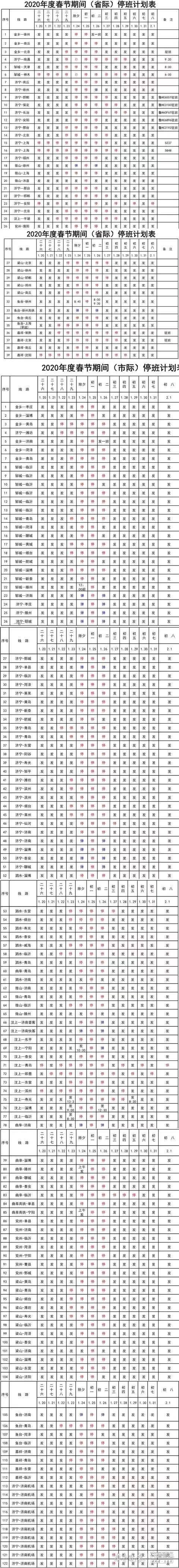 公路方面,济宁交运集团发布2020年春节期间班车计划,自1月23日(腊月二十九)起,济宁地区至北京、天津、邢台、扬州等地的长途客车临时停运,省内中短途客车主要集中在除夕当天开始停运,省内热门方向如济南、泰安、淄博等线路除夕当天也有班次。大年初一、初二绝大多数客运班次临时停运,正月初三开始,中长途客运陆续恢复。