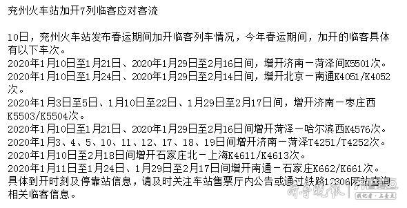 兖州火车站、济宁火车站春运期间,均加开多趟临客,其中,兖州火车站2020年1月10日至1月21日、2020年1月29日至2月16日间,增开济南—菏泽间K5501次。