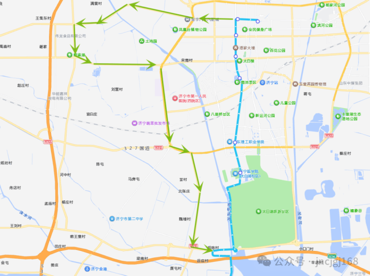 临时调整:自济宁高铁北站发车后,行至济水大道与S319省道交叉路口,沿S319省道向西行至西二环G105,沿西二环G105向南行至呈祥大道,沿呈祥大道向东返回济水大道原路线。