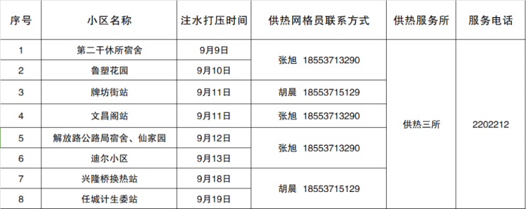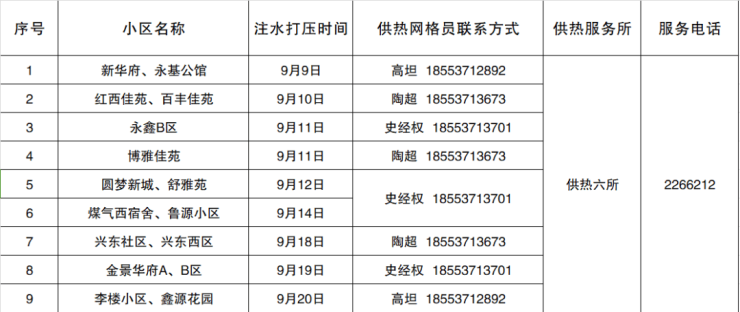 搜狐网济宁小编了解到:为了做好今冬供热准备工作,四和供热公司定于9月9日开始进行注水试压工作,请用户留意小区内注水试压通知,具体注水试压时间以小区内张贴通知为准。注水试压期间务必家中留人,自行检查室内暖气设施的完备情况,以防注水试压期间出现漏水浸泡等事故,注水试压期间如遇紧急情况或公共区域漏水可拨打供热服务热线5668060或供热所服务电话。注水试压后,管道系统内将保持压力,为了保证供热效果及管网安全请不要私自放水。