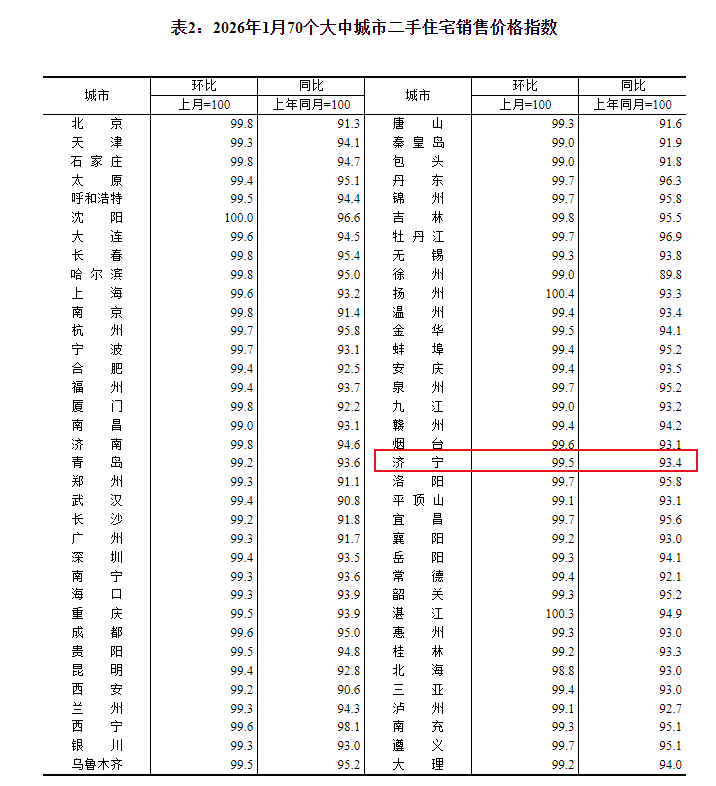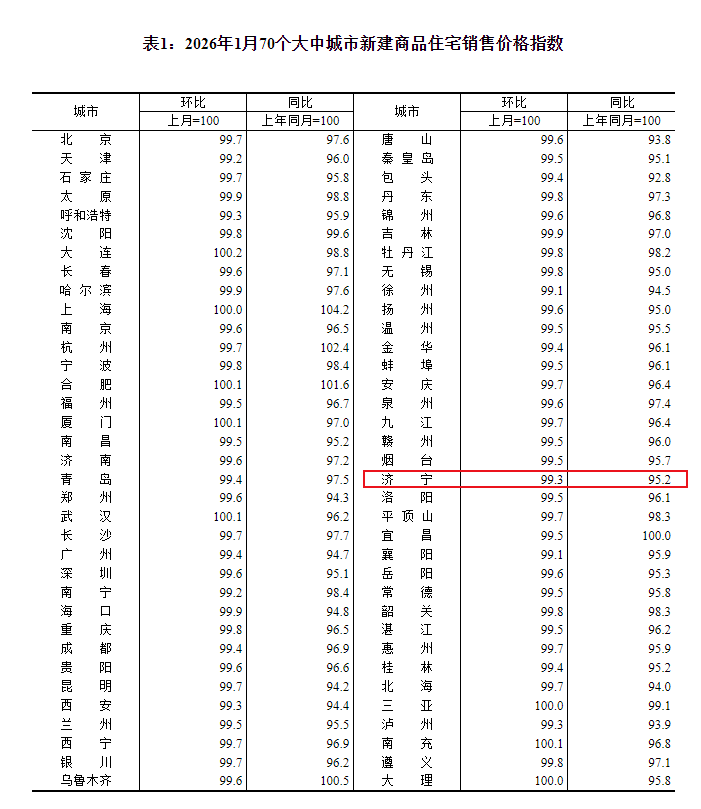 搜狐网济宁小编注意到:今早9点30分,国家统计局发布了2026年1月份70个大中城市商品住宅销售价格变动情况统计数据。2026年1月份济宁新建商品住宅销售价格环比下降0.7个百分点。