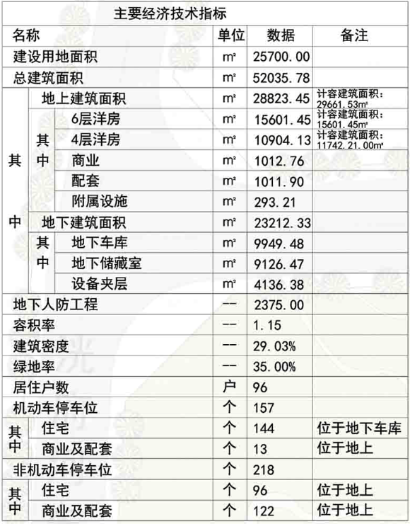 项目规划建设用地面积2.57公顷;总建筑面积:52035.78㎡;其中,地上建筑面积:28823.45㎡,地下建筑面积:23212.33㎡;4层多层住宅,一层层高3.3米,二至四层层高3.1米,建筑高度13.05米;6层多层住宅,一层层高3.5米,二至六层层高3.2米,建筑高度为20.25米;容积率为1.15;建筑密度为29.03%;绿地率为35%;计划总居住户(套)数为96户(套),居住人数约308人(按3.2人/户预算);建筑类型包括住宅、商业、公服配套设施等;规划机动车停车位157个,非机动车位218个。