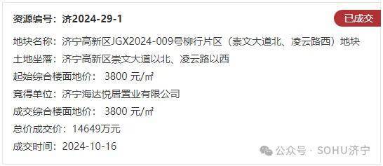 济宁高新区JGX2024-009号柳行片区(崇文大道北、凌云路西)地块【济宁海达悦居置业有限公司竞得】