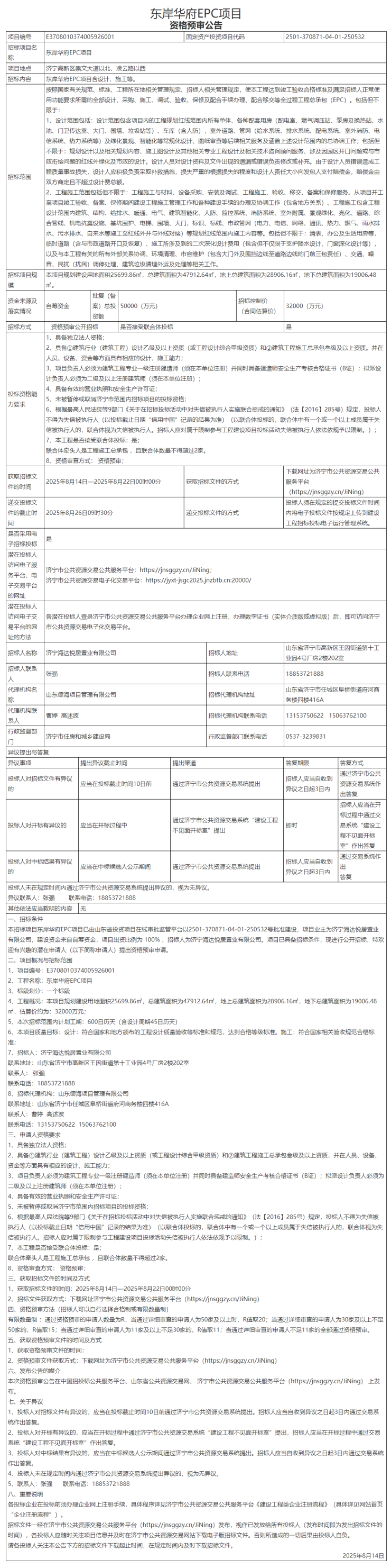 2025年8月14日,东岸华府EPC项目资格预审公告发布,招标内容含设计、施工等。