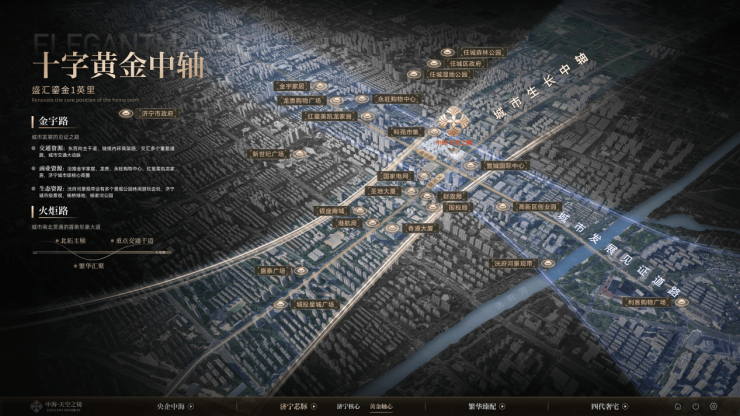 雄踞济宁火炬路与金宇路交汇处西北,占位双轴十字正芯,纵揽城市经济动脉金宇路,贯通任城、高新双核,依托驱动新老城区发展中枢的火炬路,圈定鎏金一英里核心版图。这里交通、商业、教育、生态四大核心资源在此共振,勾勒出济宁最优越的人居图景,这样的城央稀壤,济宁再无其二。