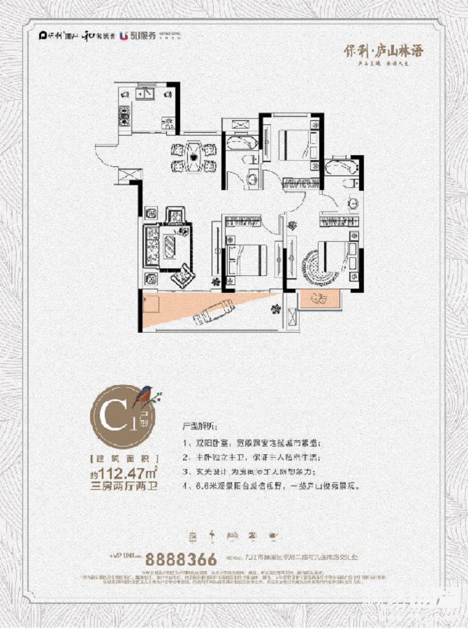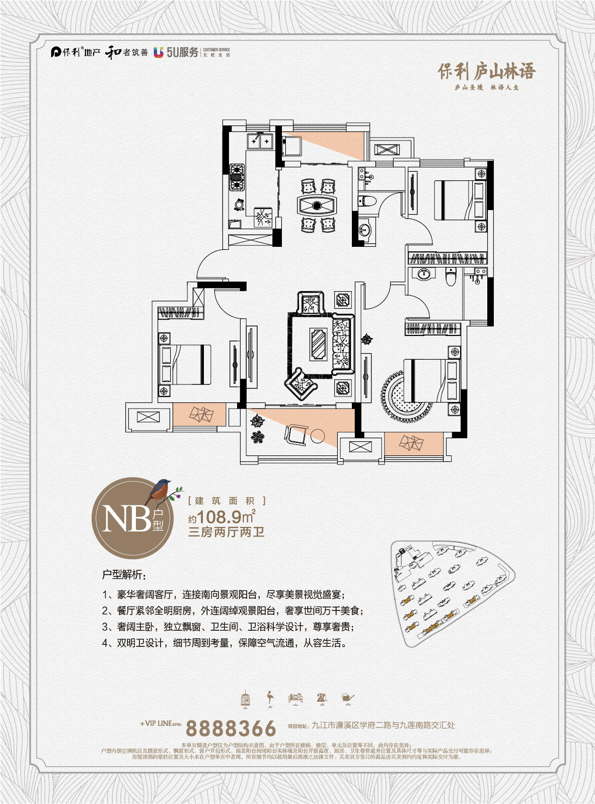 保利庐山林语是片区内少有央企开发的低密度山居人文大盘。总占地面积约353亩,总建筑面积60 万m2,容积率仅为1.98,配套3万㎡的商业中心,规划有1栋1.2万方2的学府公寓,近1.8万m2褐石风情商业步行街,还规划有国际影城和配套商业、农贸超市(将成为濂溪区较大最齐全的生活超市,改变周边传统农贸市场的形象,让您享受星级购物标准;) 项目景观打造出“三园八轴”,A区桃李天下、B区春颂夏弦、C区藏风纳水,项目整体将用100多种绿植搭配(如红枫、无患子、紫薇、碧桃等),每一地块都将给您呈现不同的视觉盛宴。整个项目的建筑风格为英伦褐石风格,汲取了世界一流大学哈佛大学、波士顿大学的建筑风格。小区采用完全人车分流的设计,封闭式管理。物业为全国排名第二的物业公司——保利物业,具有国家一级物管资质,仅次于万科物业。业务遍及全国92个大中城市(如北京、上海、广州、成都、长春、南昌等),承接的物业管理项目400余个,管理面积超过1亿平方米。
