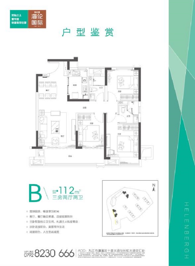 海伦堡——中国地产50强,中国房地产品牌价值TOP20,中国房地产成长性TOP10,海伦堡地产集团成立于1998年,从诞生到壮大,到发展成为全国知名的大型房地产开发企业,蝉联中国房地产50强,再到全国布局34城131个项目,海伦堡地产创造了无数建筑的经典,赢得了业界内外的掌声。海伦堡•海伦国际项目择址长虹大道与十里大道两大城市主干道交汇处,同时贯通濂溪区、浔阳老城、八里湖新区,畅享醇熟老城配套与新区发展红利,商业、教育和医疗等多元化配套环伺,畅享繁盛便利生活。同时,项目致力于打造低密生态住区,约2.2容积率,约30%绿化率,社区规划十字轴主题园林,让诗意生活舒展无界,社区内规划健康跑道、童梦乐园、健身广场等全生命周期配套,满足不同年龄层业主需求。除此之外海伦堡匠心规划健康+2.0人居体系,“健康+2.0”涵盖三大升级主张、五大健康价值体系与十个健康生活体验标准,注重客户的生活及住宅、社区公共区域的建设,为居者打造健康、良性循环的人居生态圈。