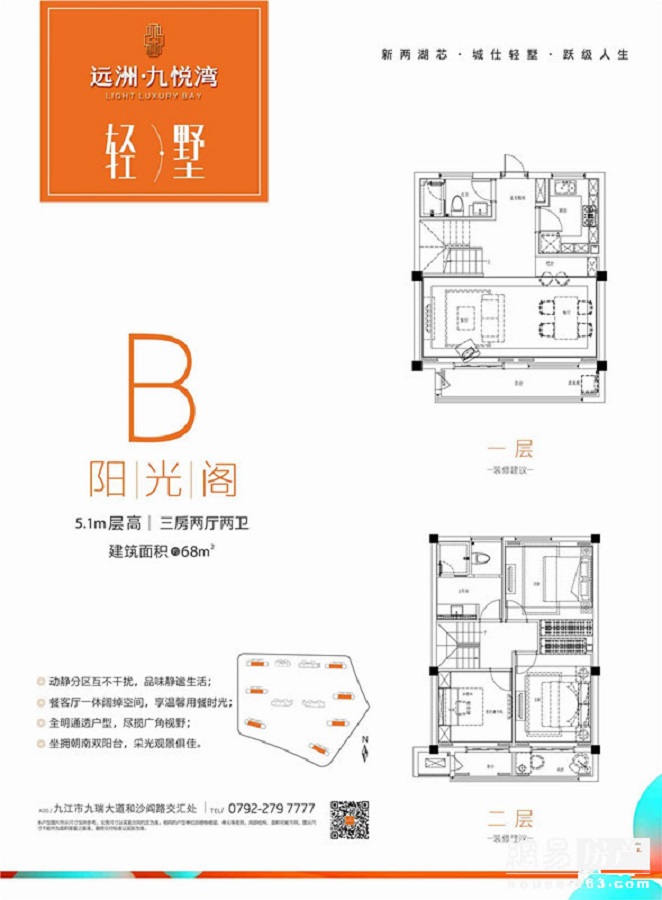 远洲地产致力创造美好生活,曾荣获“中国房地产500强”、“中国住宅100强”等多项荣誉称号;远洲地产,匠心瑧筑,以对人居梦想的尊重,先后在九江打造远洲·国际公寓、柴桑春天和远洲·九悦廷;远洲携手九鼎集团,双强联袂续写“九悦”系列新品——九悦湾,旨在为九江人民打造一座愉悦舒居的港湾。 远洲·九悦湾落址八里湖北新两湖腹地,位于九瑞大道与沙阎北路交汇处,享受保税区发展红利;200亿浔阳古城(规划建设)、大润发时代广场、九方购物中心、联盛快乐城、九江国际会展中心、小中高等一站式教育资源、九江第三人民医院与九江市开发区人民医院优质医疗资源等多元化配套环伺,未来更将与柴桑区、高铁新区共同打造城西城市副中心! 九江市首创5.1m挑高,建筑面积64-78㎡城仕轻墅,买一层享两层。64㎡可做三房两厅两卫,两房朝南,客厅朝南。78㎡可做四房两厅两卫,三房朝南,客厅朝南。 花小价钱,享受高品质生活,让空间灵动可变,让生活舒适惬意。 远洲集团起步于1987年,现在已经发展成为一家集高档酒店管理、房地产开发、石油化工三大产业于一体的全国性企业集团,我们集团在浙江、安徽、江西、辽宁、内蒙古等数十个子公司,现集团总部在上海。 2、我们远洲人恪守“提高生活品质、创造社会价值”的企业使命,秉承谦诚、务实、合作、进去的风格,一直朝着“远洲创造美好生活”美好愿景的努力,这也是远洲九悦廷项目的品质比其他项目要好的重要原因。 3、远洲集团2005年进入九江,打造了九江排名前列家五星级酒店,而远洲九悦湾项目也是远洲国际公寓、柴桑春天和九悦廷之后的升级之作,也是我们远洲人在九江所要打造的五星级服务居家的标杆项目。