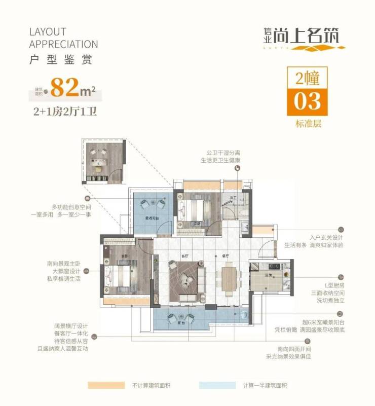 片区少有高实用率N+1灵动户型,建筑面积约82-97㎡三房。以南向景观主流设计,同时考虑各功能分区合理运用,实现户型高增送弹性实用空间与南向景观最大化。