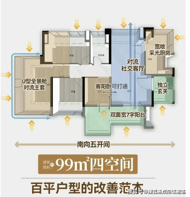 99㎡四房:真正南北通透,四开间朝南,L型阳台贯通客厅与次卧,空间感强,功能分区合理,堪称塔楼中的“改善级”产品。