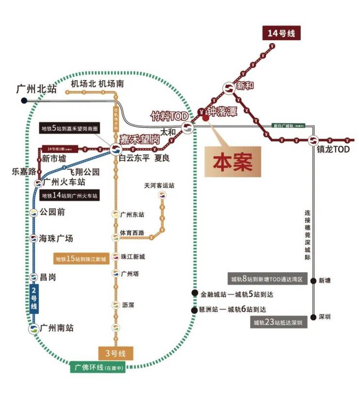 14号线地铁站钟落潭,新百广城轨,广佛环线 15分钟白云机场北站,京港澳高速,机场第二高速,花莞高速,新广从快速路