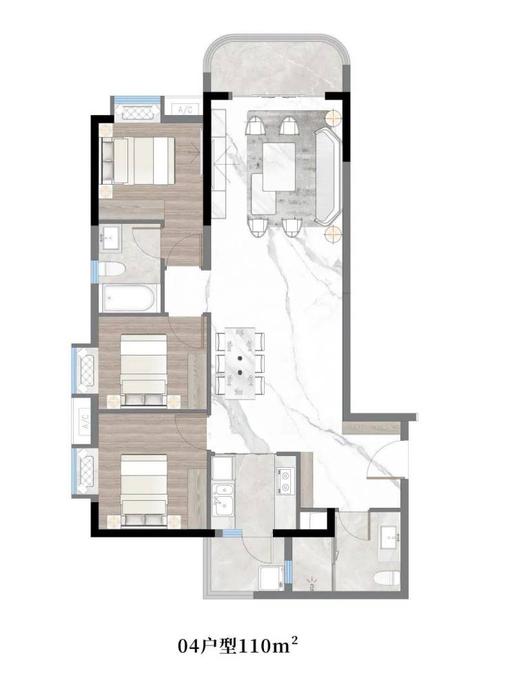 04户型:约110㎡,三房两厅两卫带主套