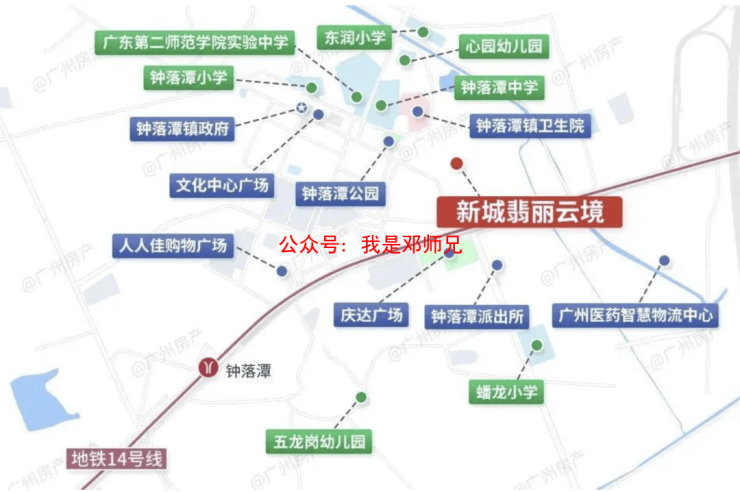 地铁:项目位于地铁 14 号线钟落潭站旁,距离约 1000 米,5 站到嘉禾望岗,换乘 2、3 号线可直通白云新城及广州全城;地铁站有项目指示牌,且有公交车一站直达,更为便捷。18 号线北延段(在建中)建成后,在白云东平站与 14 号线交汇,换乘 7 站可到冼村。