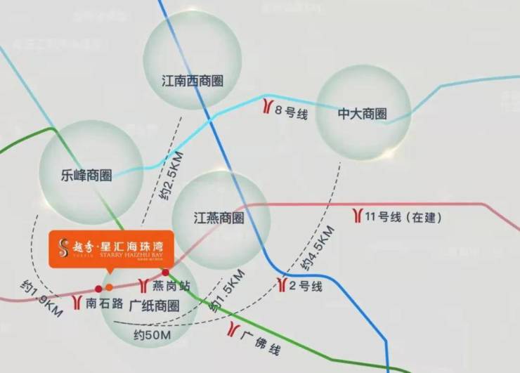 地铁——广佛线燕岗站大约500米,从这里出发向西直达佛山,向东接驳地铁2、3号线,能快速抵达珠江新城、白云新城等;地铁11号线(在建)南石路站,就在家楼下,广州首条环城地铁,开通后直接串联5大中心区,一路经过广州东、琶洲等商务区以及广州火车站、广州东站两大交通枢纽,无论是上班通勤还是商务出差,一条地铁就能解决出行问题。