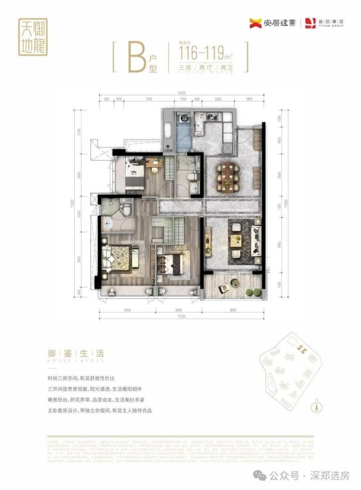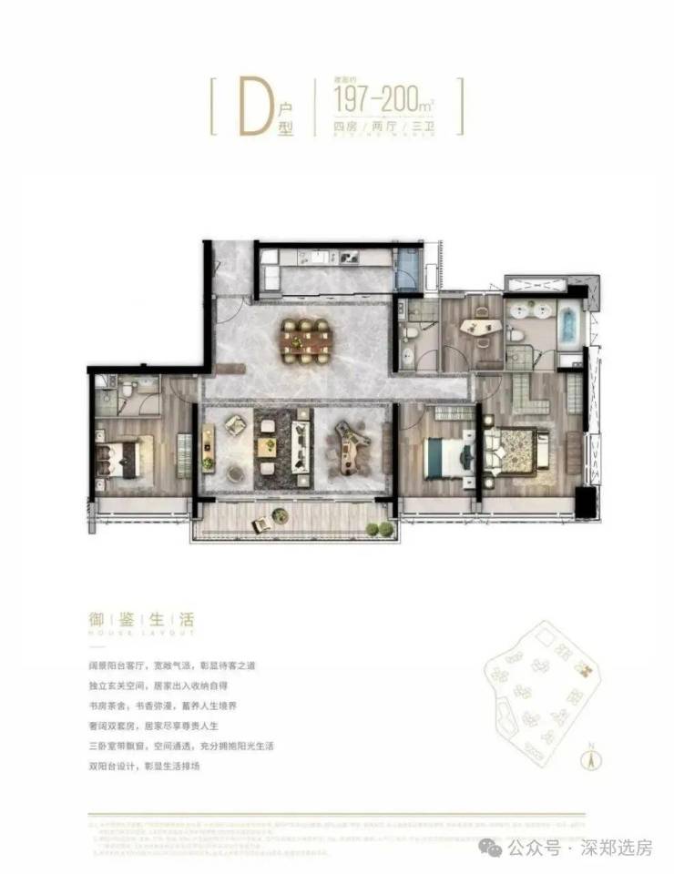 臻稀阔邸,抢藏从速:建面约103-200㎡3-4房宽境美宅,罗湖屈指可数的纯粹绝版大户型高端住区,全景观超大阳台,将山景、水景、园景尽收眼底;双主卧套房配置,纵享私密奢华空间。