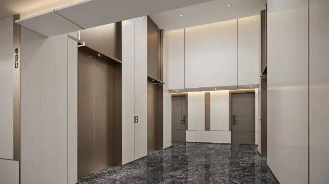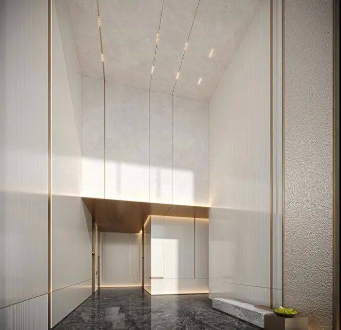 项目突破常规,在公共区域大面积运用岩板与奢华金属元素,搭配嵌入式金属踢脚设计,以精工匠心提升空间质感,重塑归家仪式体验