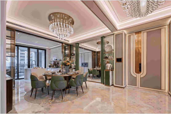 墙壁使用香雪灰奢石,厨房门采用玫瑰金金属外框玻璃门;