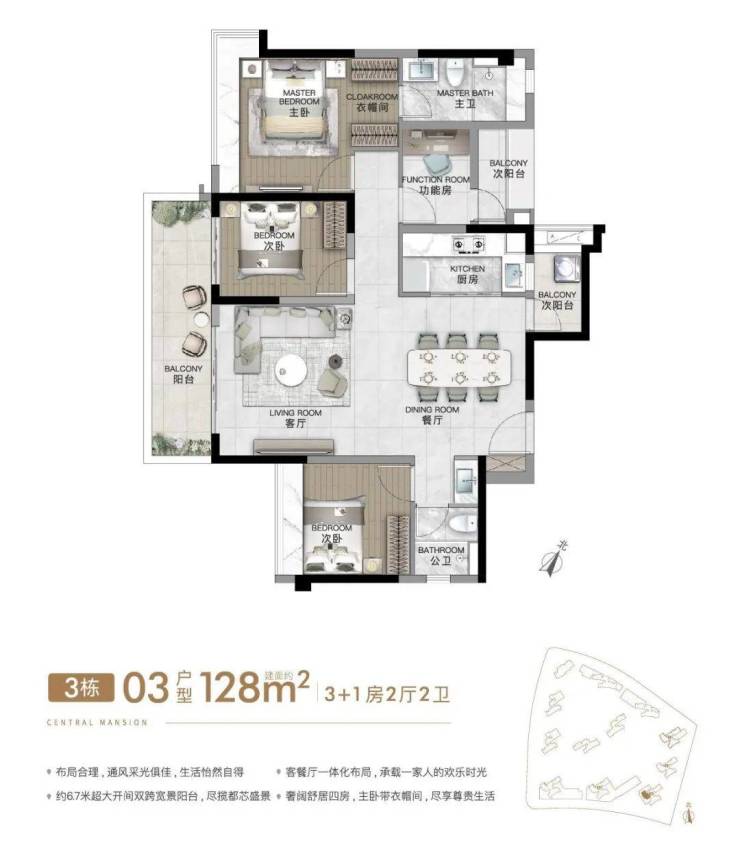 建面约128㎡4房2厅2卫(竖厅)豪华主卧套房,超大270°转角飘窗,双阳台对流,大面宽采光面+超大方厅,约13.9m超大南向采光面。