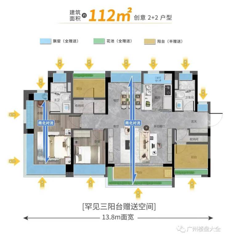 约112㎡户型相当于市面约150㎡户型,最大的亮点就是有接近5.2米的大方厅,三阳台高拓空间,让户型空间和生活方式更加百变,根据家庭不同阶段需求,打造“会生长”的房子。