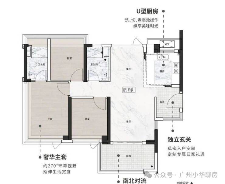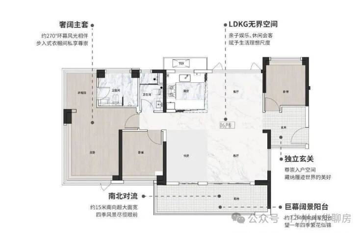 餐客厅一体化设计,连通约7.2米南向阔景阳台,亲友聚会无压力;主卧带步入式衣帽间,私密性更佳。