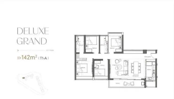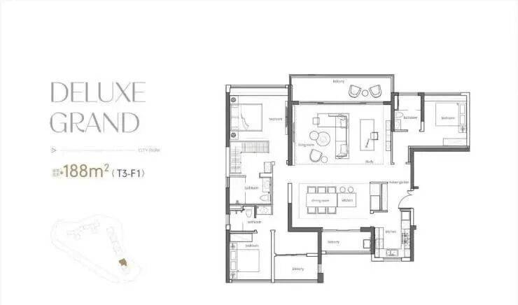 190方户型,四房两厅三卫双套房,T2组合、7米大阳台、9米阔卓厅堂、近55方餐厅,诠释了功能与奢适完美相融